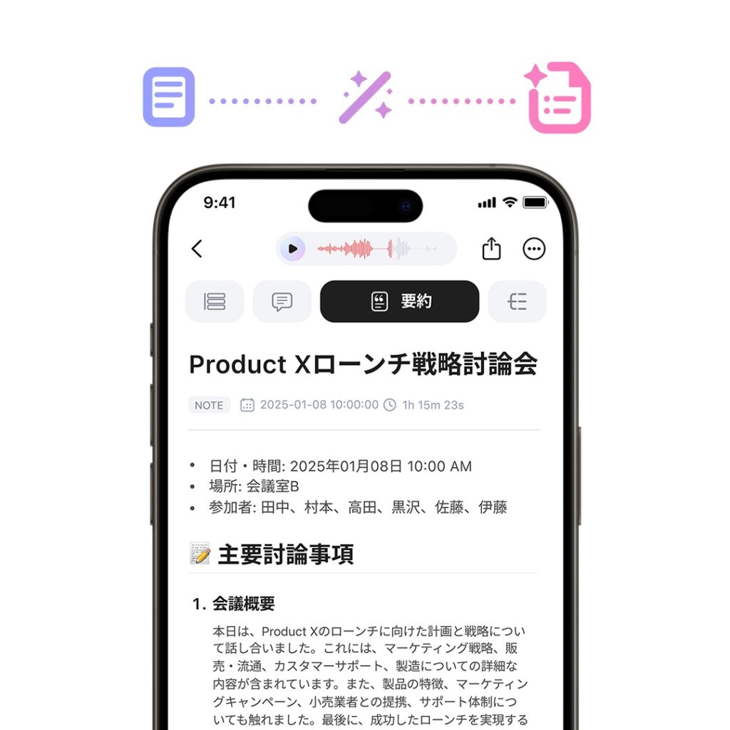 会議内容から要点を抽出し、読みやすい要約や議事録を自動生成できます。